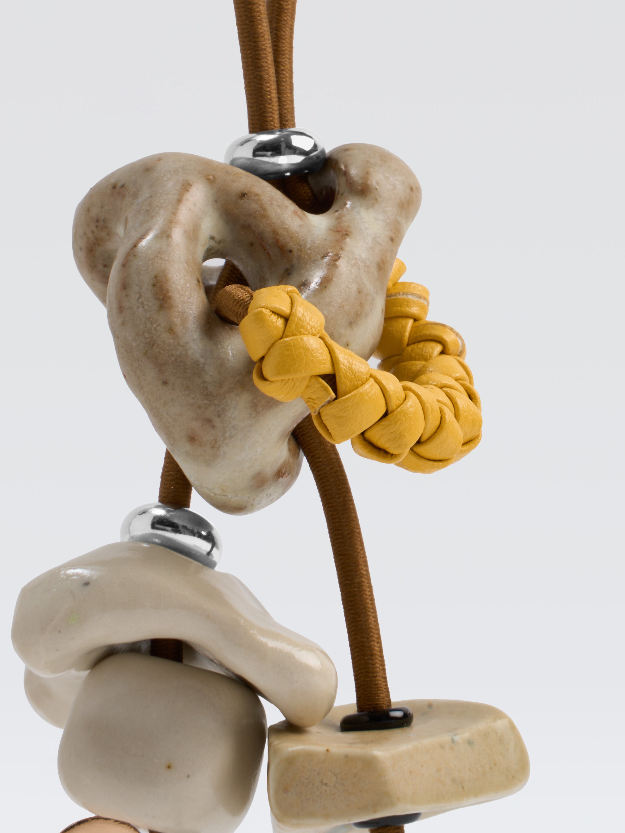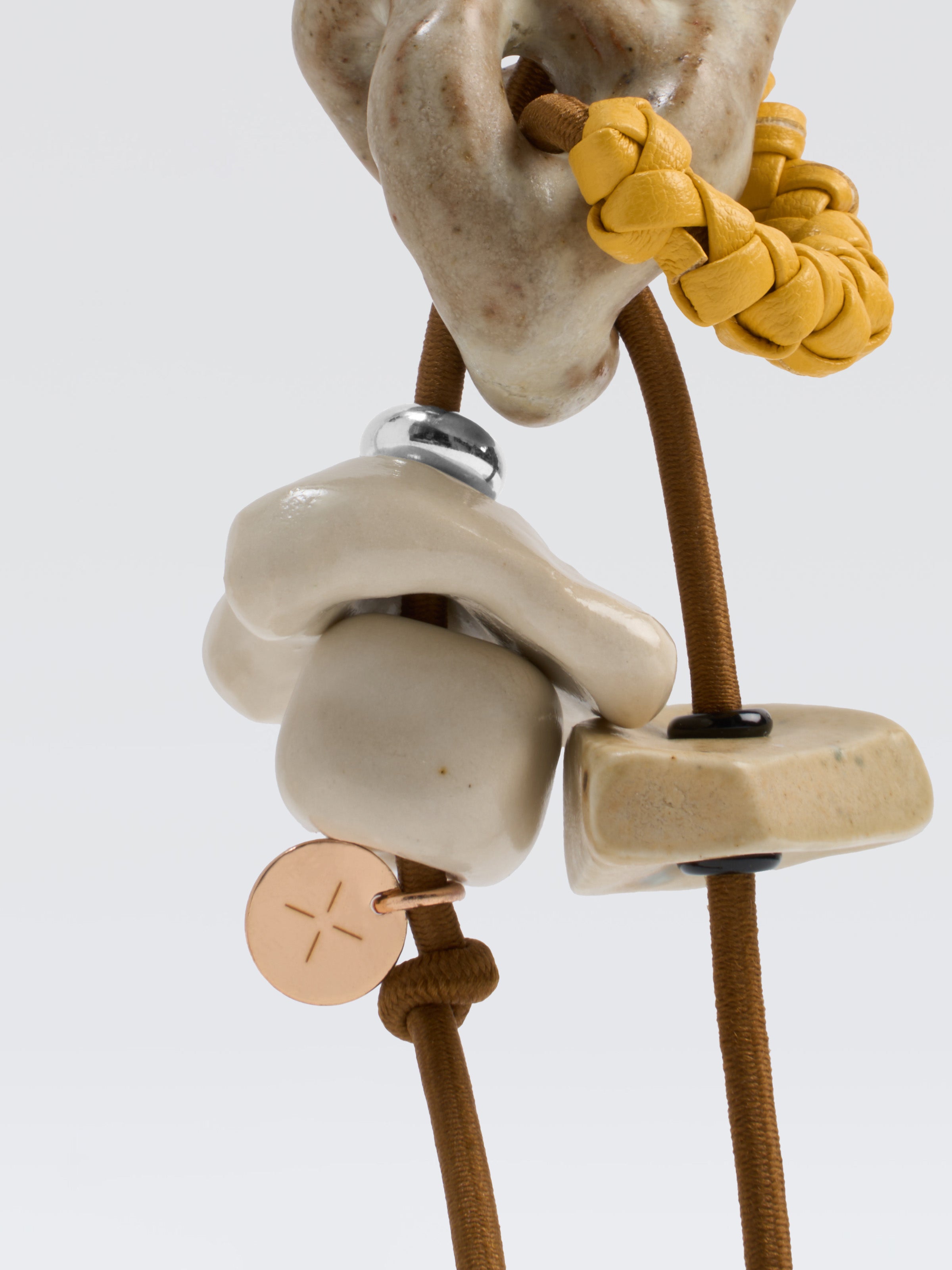 Material: Stoneware clay (ceramics), metal, leather and elastic cord