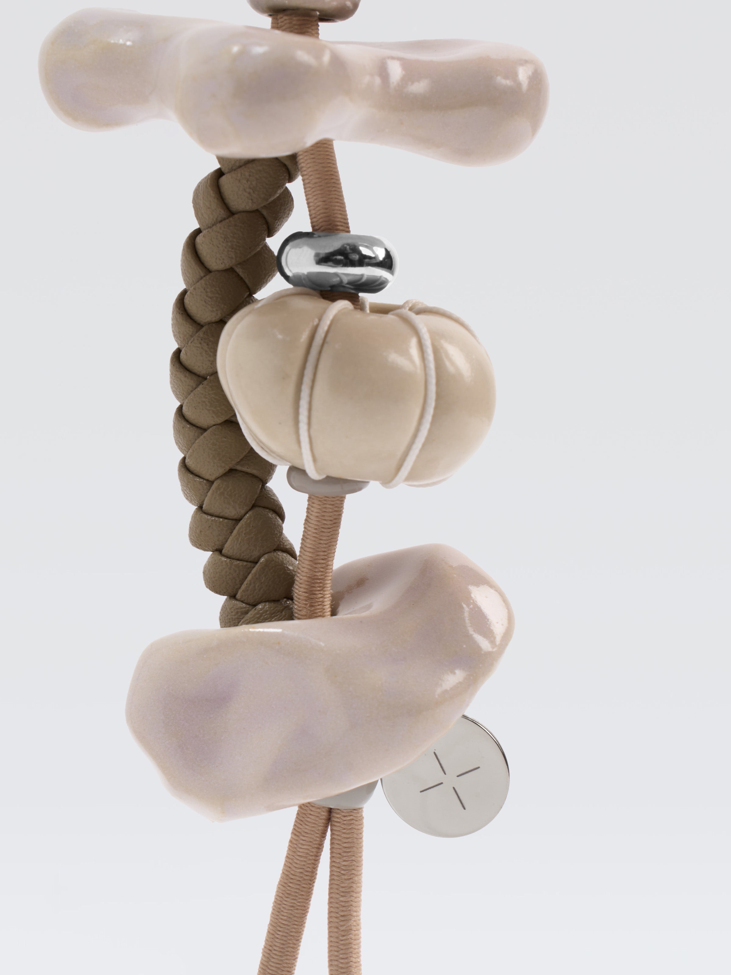 Material: Stoneware clay (ceramics), metal, leather and elastic cord
