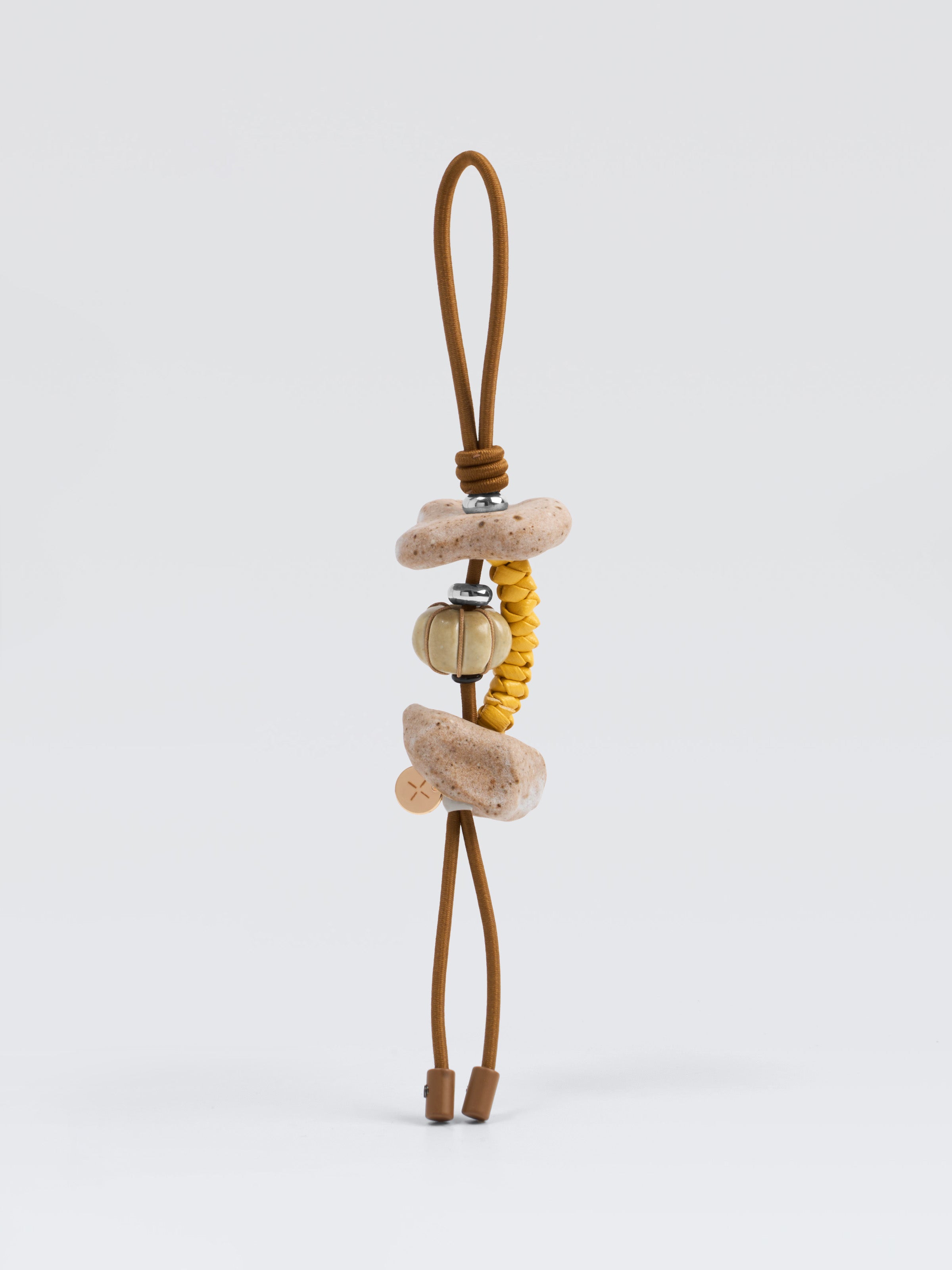 Material: Stoneware clay (ceramics), metal, leather and elastic cord